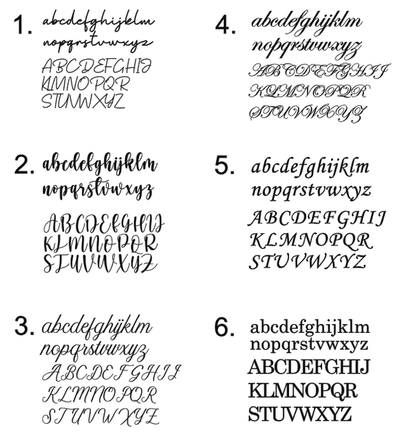 Je kan kiezen uit de verschillende lettertypes of je eigen lettertype. Kies je voor een eigen lettertype? Mail het pdf-bestandje naar naar info@personalisedbysien.be .